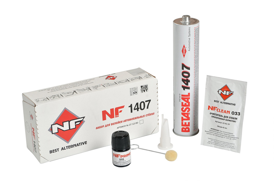 Состав набора: 1. Клей-герметик для вклейки автостёкол NF 1407 (картридж 310 мл.) – 1 шт. 2. Носик для картриджа пластиковый стандартный с вырезом – 1 шт. 3. Праймер для стекла и металла NFPrime 055 (баночка 10 мл.) – 1 шт. 4. Аппликатор для праймера меховой 105 мм – 1 шт. 5. Обезжириватель для стекла NFClean 033 (пропитанная салфетка 8 мл.) – 1 шт. BETASEAL 1407 - однокомпонентный, имеющий среднюю вязкость, влагостойкий полиуретановый клей-герметик для вклейки автомобильных стекол с быстрой схватывающей способностью и коротким периодом готовности автомобиля к безопасной эксплуатации после вклейки. Кроме того, он имеет высокий модуль сдвига, очень низкое объемное удельное сопротивление и хорошие высокочастотные характеристики. Благодаря данным свойствам клея BETASEAL 1407 можно получить повышенную жесткость кузова и полную совместимость с монтируемой на стекле антенной. Рекомендуется использовать в комбинации с очистителем и праймером для стекла и кузова. 1. Время начала безопасной эксплуатации а/м: - без подушек безопасности/1 подушка - 2 часа - две подушки безопасности - 4 часов 2. G- модуль = 2 МПа 3. Электропроводность - диэлектрик.